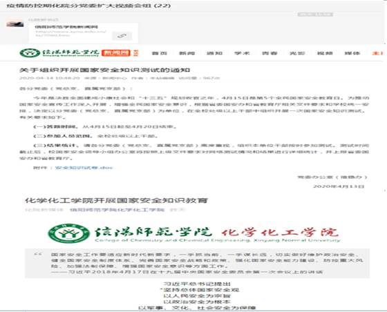 4月15日,结合第五个国家安全教育日主题,按照上级党组织和学校党委《关于组织开展国家安全知识测试的通知》《关于组织收看国家安全典型案例专题宣传片的通知》等要求,永利集团304am官方入口分党委结合新冠肺炎疫情防控、开学复学准备工作实际,通过多种形式、多种渠道,及时开展了师生专题学习教育活动,积极营造了共筑国家安全人民防线的浓厚氛围。