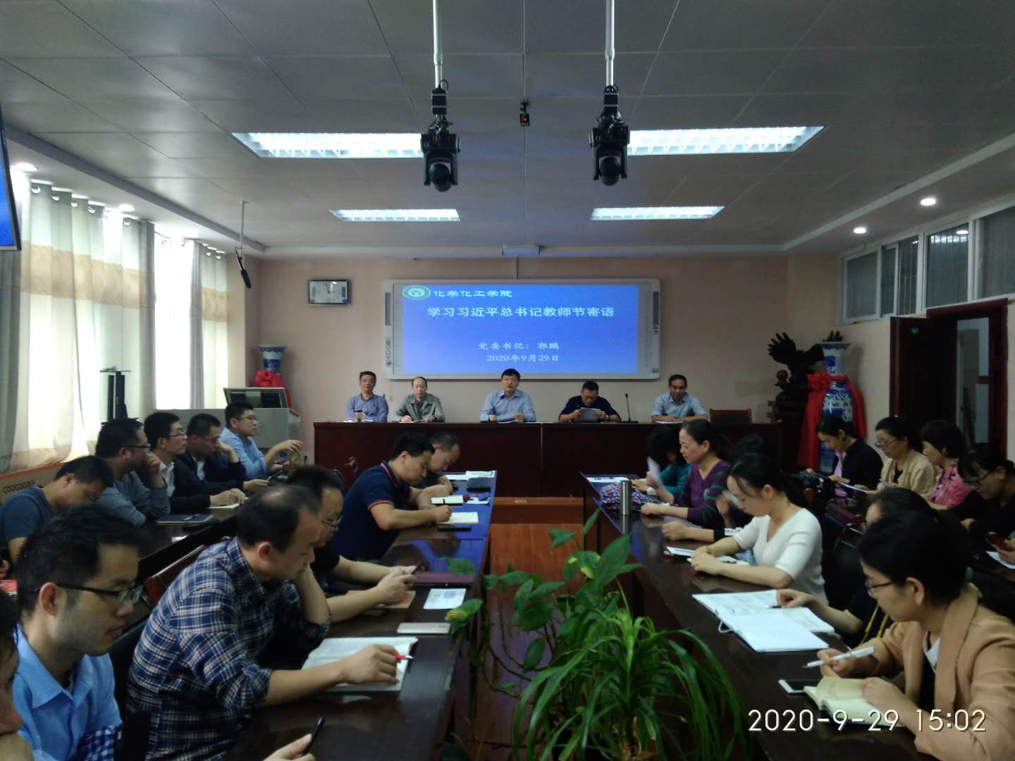 9月29日,永利集团304am官方入口在化学楼407报告厅召开全体教职工大会,专题学习习总书记教师节寄语。永利集团304am官方入口全体教师集体参加学习,学习会由党委书记郭鹏主持并宣讲领学解读。